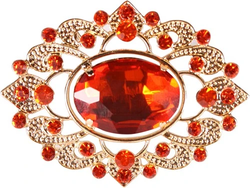 Details: goudkleurige baretspeld met kleine rode steentjes en 1 grote rode steen