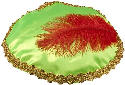 Details: er zit een veer op en is afgezet met een rand van goud galon. De barret heeft een satijn look