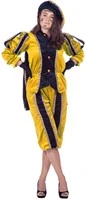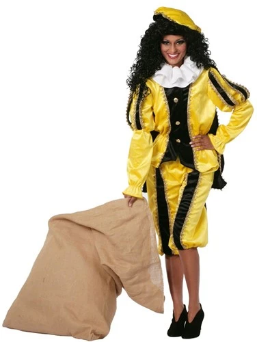 Mooi geel zwarte pietenpak van zeer goede kwaliteit. Het pak bestaat uit een bovenstuk met cape, broek en de baret.