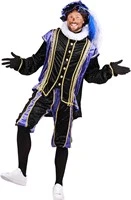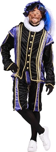 Een erg mooi pietenpak met paarse tinten dat gemaakt is van velours de panne. Het Pieten-kostuum is afgezet met een gouden gallon band. Verkrijgbaar in meerdere kleuren. Dit pietenpak bestaat uit: